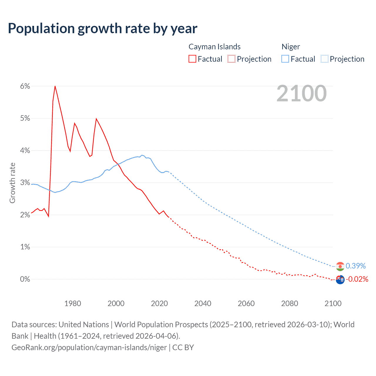 - For the last 10 years, the Cayman Islands has had an average growth rate of +2.19% per year vs +3.5% in Niger.