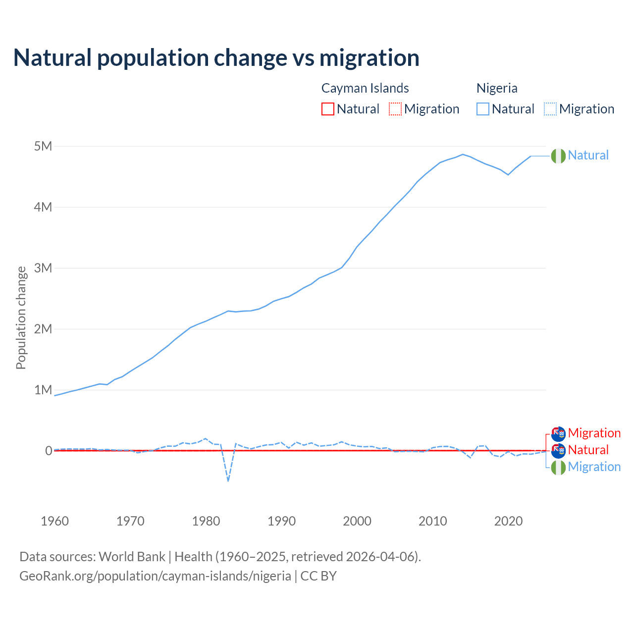 Over the last 10 years, 31.1% of the population change in the Cayman Islands is from natural causes (a gain of 4,468 people) and 68.9% is from migration (a gain of 9,879 people). In Nigeria 99.2% is from natural causes (a gain of 47,163,517 people) and 0.77% is from migration (a loss of 368,103 people).