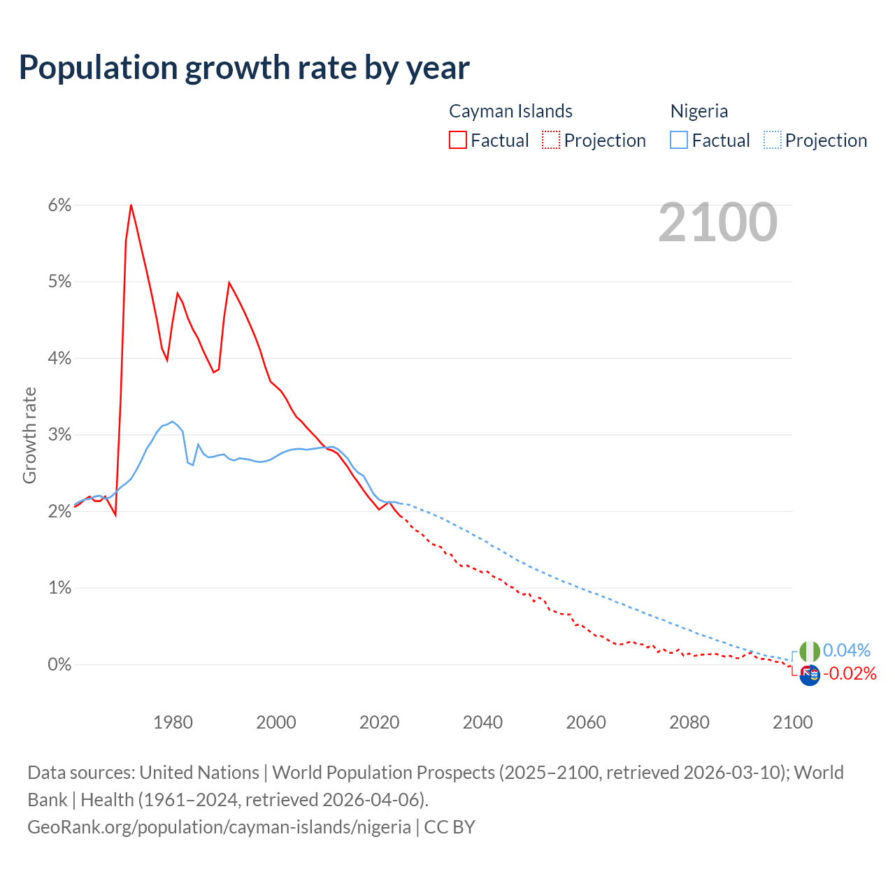 - For the last 10 years, the Cayman Islands has had an average growth rate of +2.19% per year vs +2.31% in Nigeria.