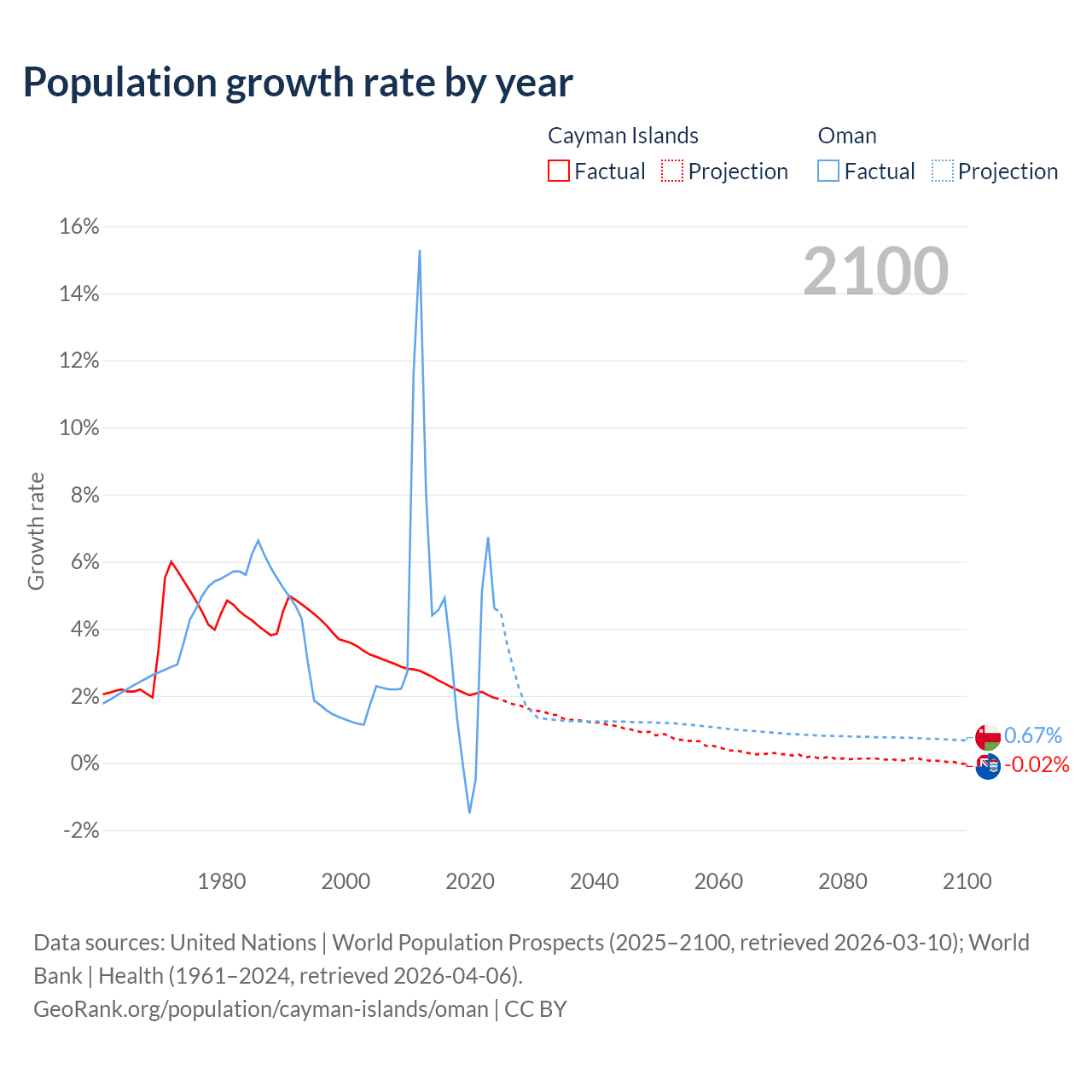 - For the last 10 years, the Cayman Islands has had an average growth rate of +2.19% per year vs +2.99% in Oman.