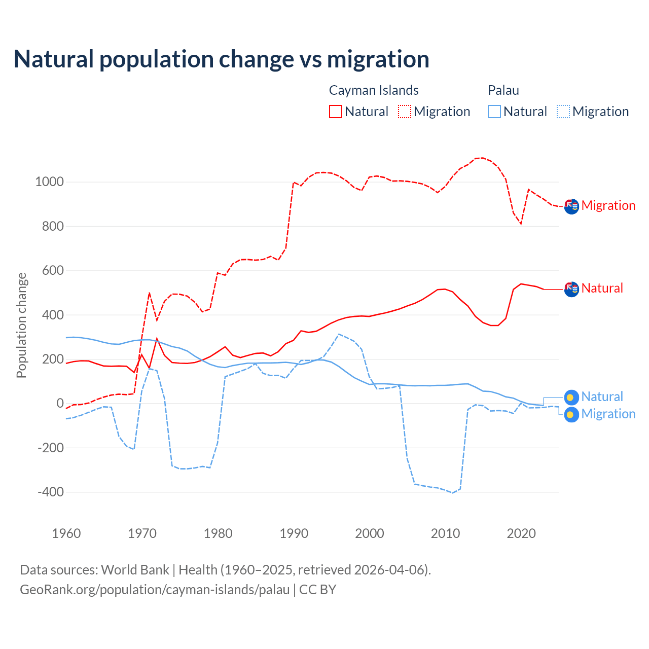 Over the last 10 years, 31.1% of the population change in the Cayman Islands is from natural causes (a gain of 4,468 people) and 68.9% is from migration (a gain of 9,879 people). In Palau 53.8% is from natural causes (a gain of 264 people) and 46.2% is from migration (a loss of 227 people).