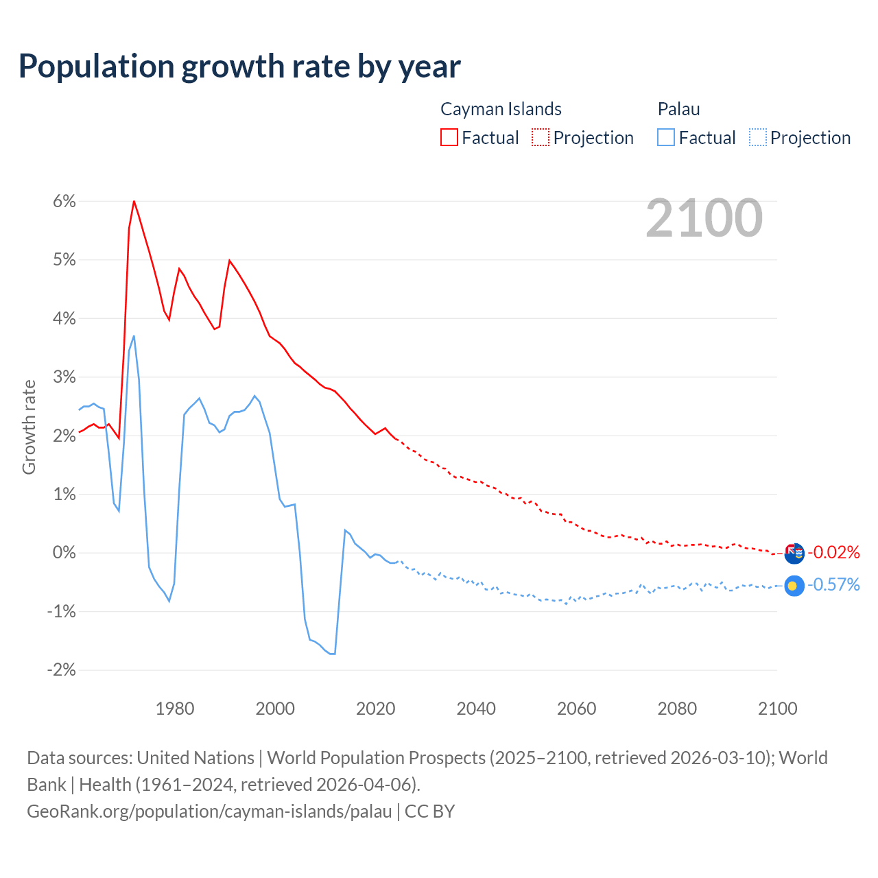 - For the last 10 years, the Cayman Islands has had an average growth rate of +2.19% per year vs +0.02% in Palau.