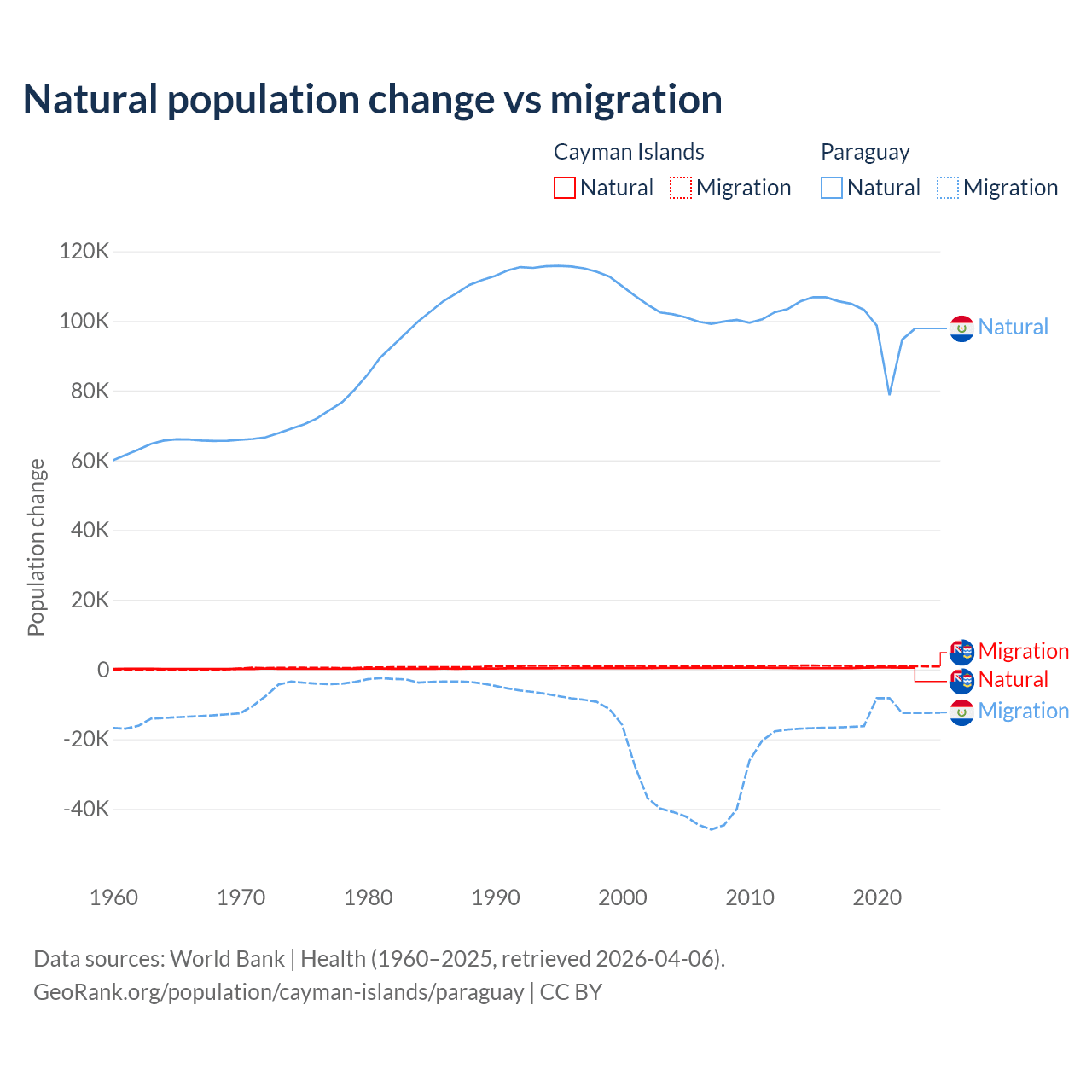 Over the last 10 years, 31.1% of the population change in the Cayman Islands is from natural causes (a gain of 4,468 people) and 68.9% is from migration (a gain of 9,879 people). In Paraguay 87.6% is from natural causes (a gain of 1,002,636 people) and 12.4% is from migration (a loss of 141,377 people).