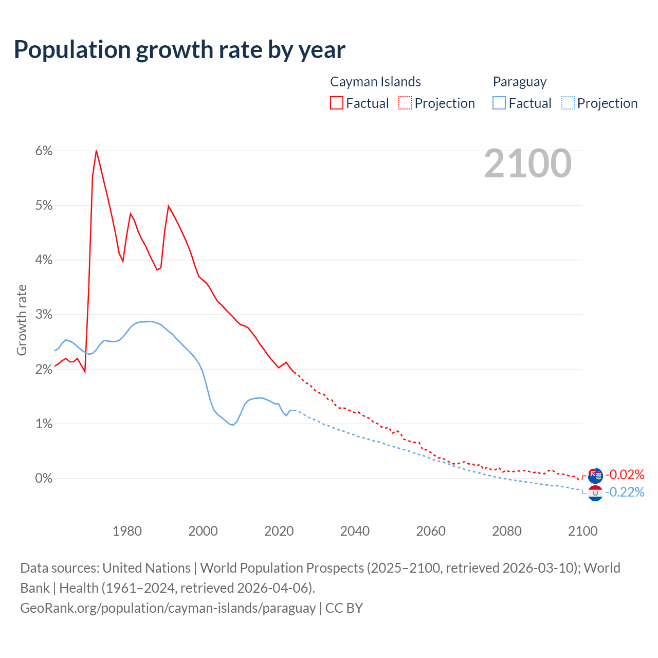 - For the last 10 years, the Cayman Islands has had an average growth rate of +2.19% per year vs +1.34% in Paraguay.