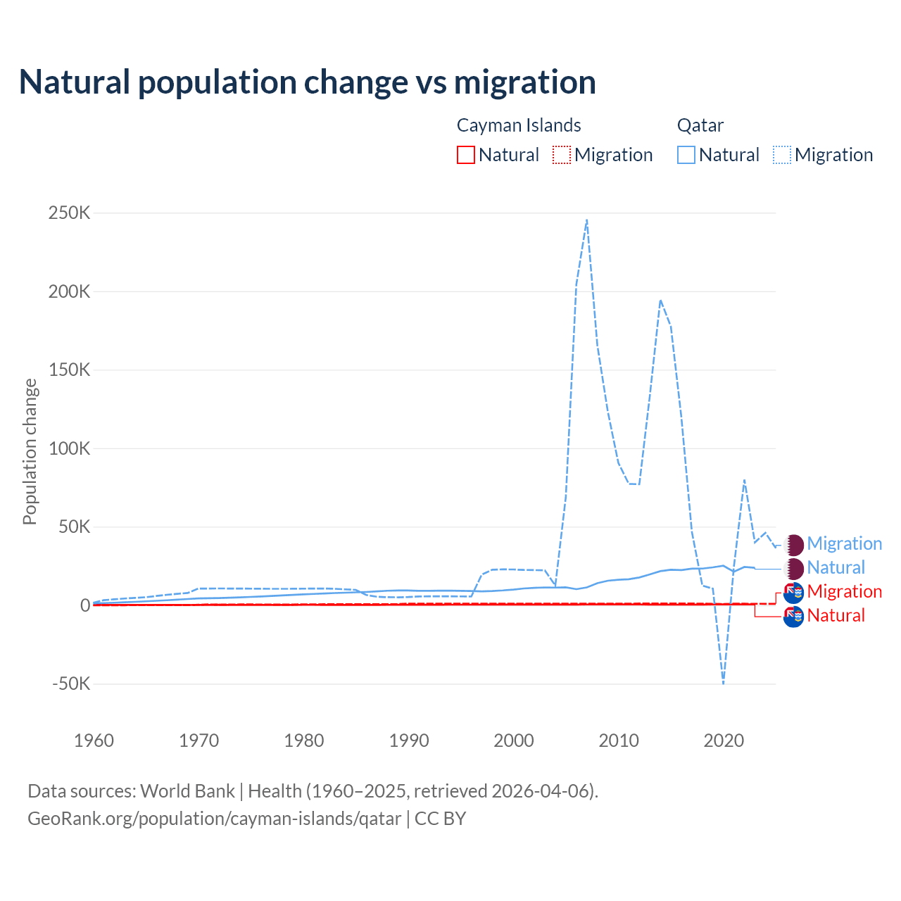 Over the last 10 years, 31.1% of the population change in the Cayman Islands is from natural causes (a gain of 4,468 people) and 68.9% is from migration (a gain of 9,879 people). In Qatar 26.1% is from natural causes (a gain of 232,009 people) and 73.9% is from migration (a gain of 655,712 people).