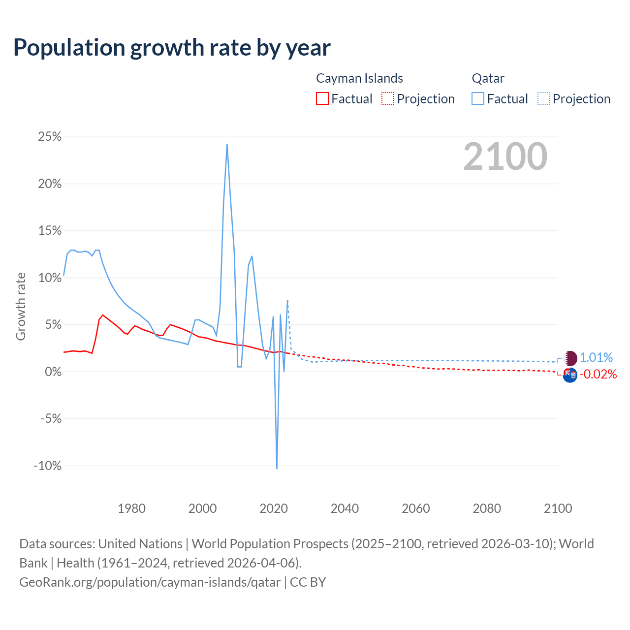 - For the last 10 years, the Cayman Islands has had an average growth rate of +2.19% per year vs +3.86% in Qatar.