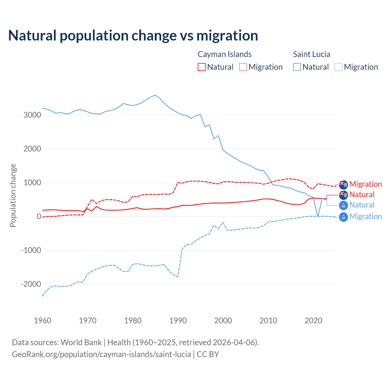 Over the last 10 years, 31.1% of the population change in the Cayman Islands is from natural causes (a gain of 4,468 people) and 68.9% is from migration (a gain of 9,879 people). In Saint Lucia 95.7% is from natural causes (a gain of 6,039 people) and 4.31% is from migration (a loss of 272 people).