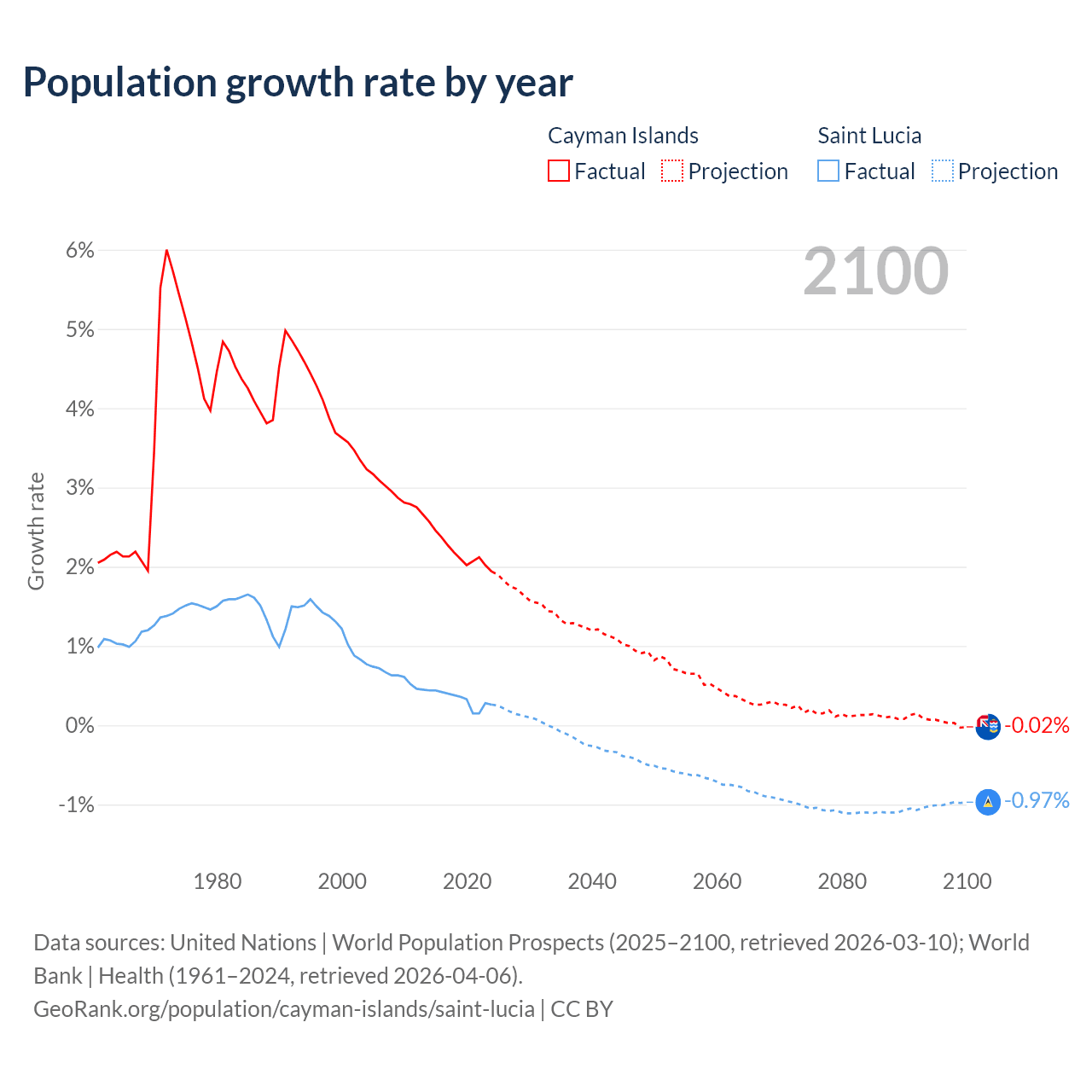 - For the last 10 years, the Cayman Islands has had an average growth rate of +2.19% per year vs +0.33% in Saint Lucia.