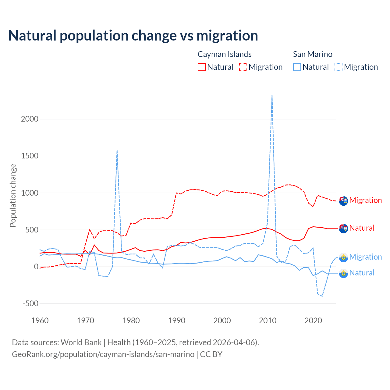 Over the last 10 years, 31.1% of the population change in the Cayman Islands is from natural causes (a gain of 4,468 people) and 68.9% is from migration (a gain of 9,879 people). In San Marino 40.9% is from natural causes (a loss of 358 people) and 59.1% is from migration (a gain of 517 people).
