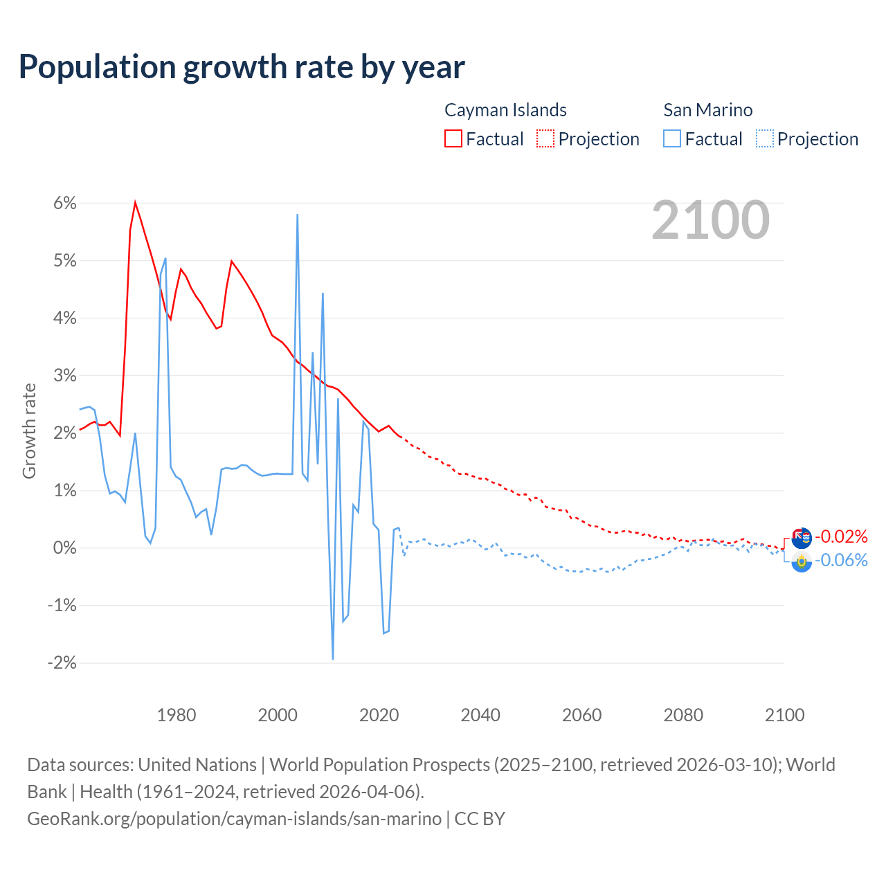 - For the last 10 years, the Cayman Islands has had an average growth rate of +2.19% per year vs +0.26% in San Marino.