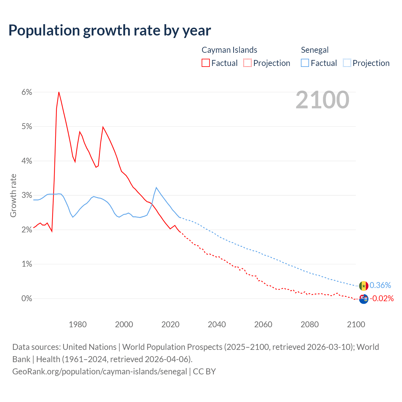 - For the last 10 years, the Cayman Islands has had an average growth rate of +2.19% per year vs +2.76% in Senegal.