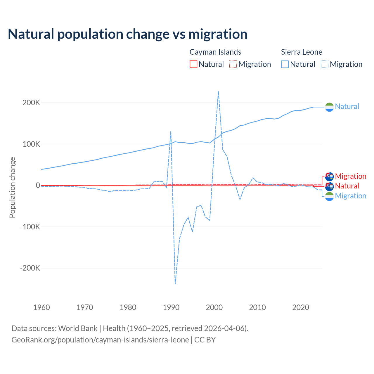 Over the last 10 years, 31.1% of the population change in the Cayman Islands is from natural causes (a gain of 4,468 people) and 68.9% is from migration (a gain of 9,879 people). In Sierra Leone 99.6% is from natural causes (a gain of 1,764,049 people) and 0.41% is from migration (a loss of 7,211 people).