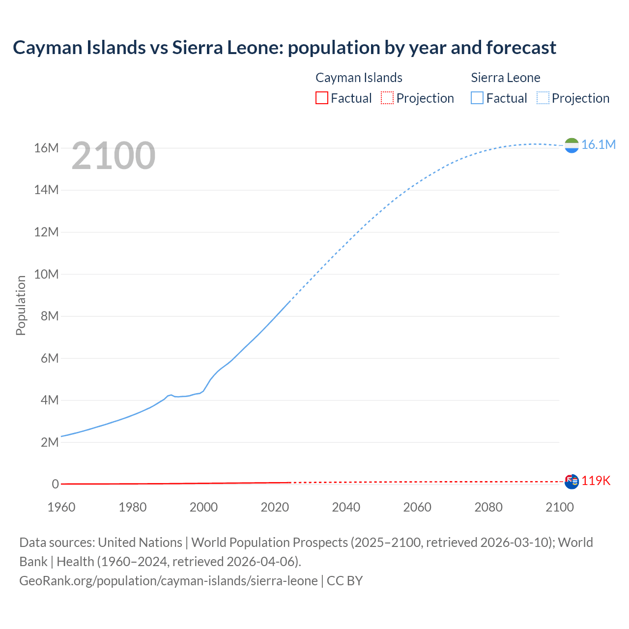 The latest officially reported population of the Cayman Islands was 74,457 in 2024 vs 8,642,022 people in Sierra Leone in 2024. In 2026, based on the adjusted UN estimation, the current Cayman Islands' population is 77,619 people compared to 9,049,533 in Sierra Leone.