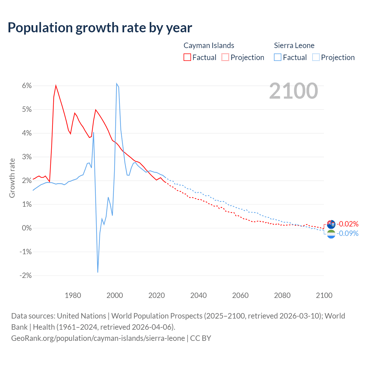- For the last 10 years, the Cayman Islands has had an average growth rate of +2.19% per year vs +2.32% in Sierra Leone.