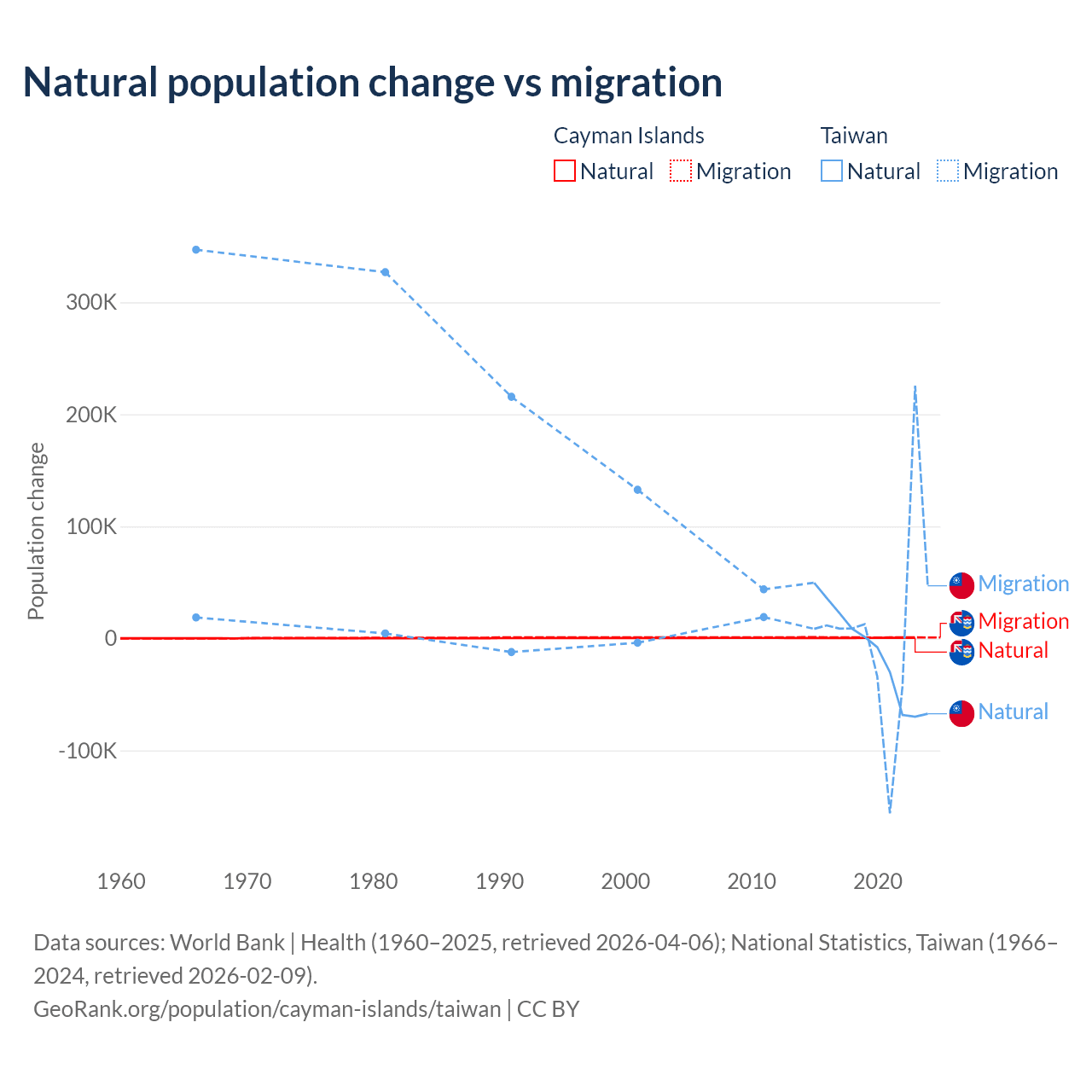 Over the last 10 years, 31.1% of the population change in the Cayman Islands is from natural causes (a gain of 4,468 people) and 68.9% is from migration (a gain of 9,879 people). In Taiwan 56.7% is from natural causes (a loss of 57,467 people) and 43.3% is from migration (a gain of 43,884 people).