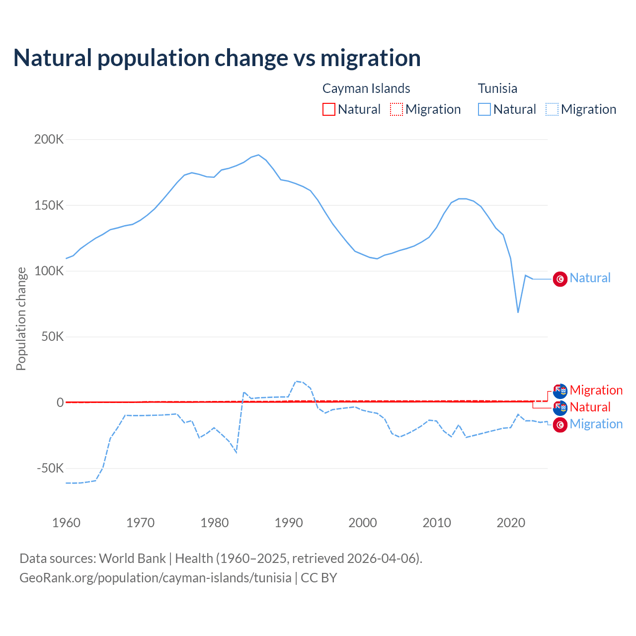Over the last 10 years, 31.1% of the population change in the Cayman Islands is from natural causes (a gain of 4,468 people) and 68.9% is from migration (a gain of 9,879 people). In Tunisia 86.3% is from natural causes (a gain of 1,225,079 people) and 13.7% is from migration (a loss of 195,011 people).