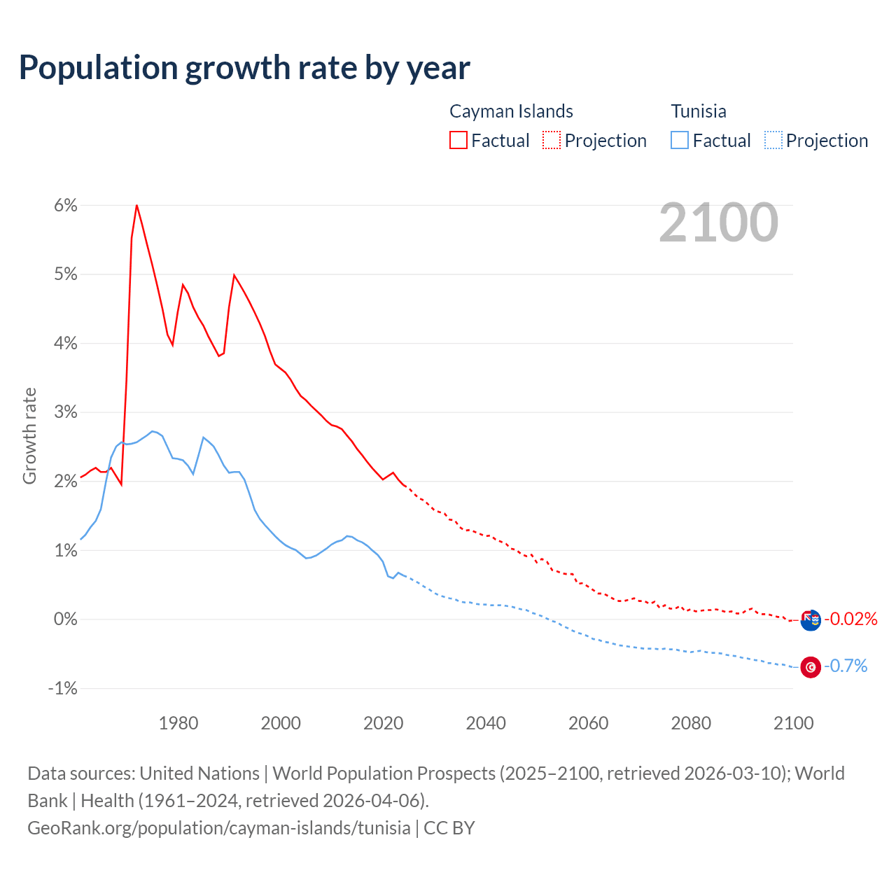 - For the last 10 years, the Cayman Islands has had an average growth rate of +2.19% per year vs +0.89% in Tunisia.