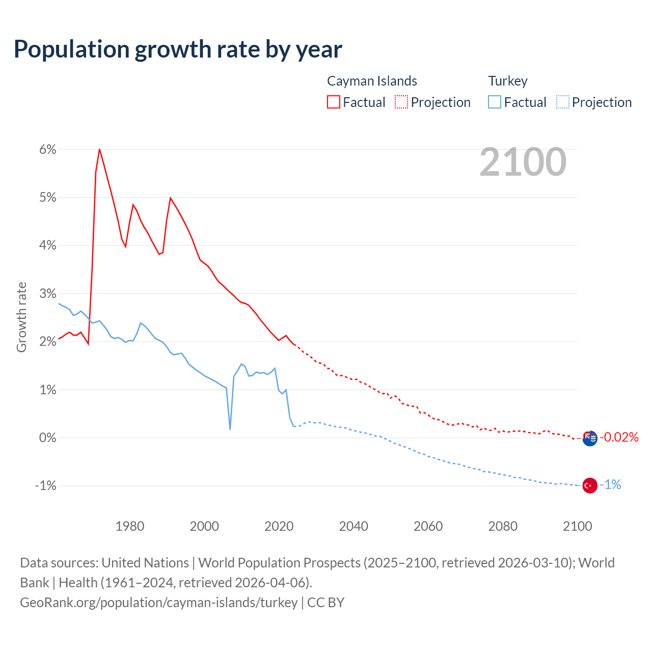 - For the last 10 years, the Cayman Islands has had an average growth rate of +2.19% per year vs +1.06% in Turkey.