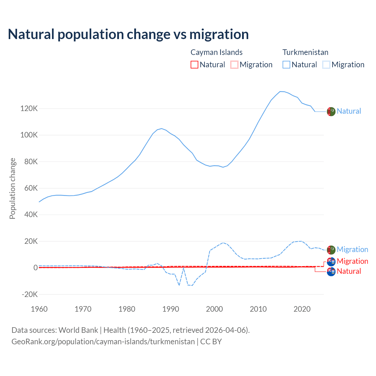 Over the last 10 years, 31.1% of the population change in the Cayman Islands is from natural causes (a gain of 4,468 people) and 68.9% is from migration (a gain of 9,879 people). In Turkmenistan 89.2% is from natural causes (a gain of 1,270,228 people) and 10.8% is from migration (a gain of 154,379 people).