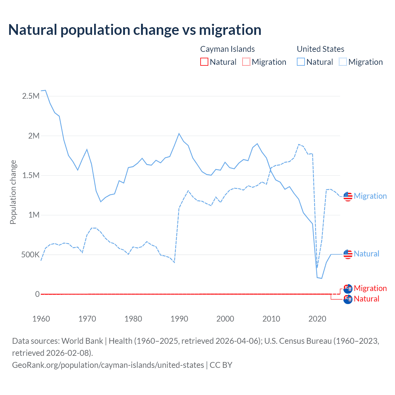 Over the last 10 years, 31.1% of the population change in the Cayman Islands is from natural causes (a gain of 4,468 people) and 68.9% is from migration (a gain of 9,879 people). In the United States 35.8% is from natural causes (a gain of 8,005,866 people) and 64.2% is from migration (a gain of 14,334,286 people).