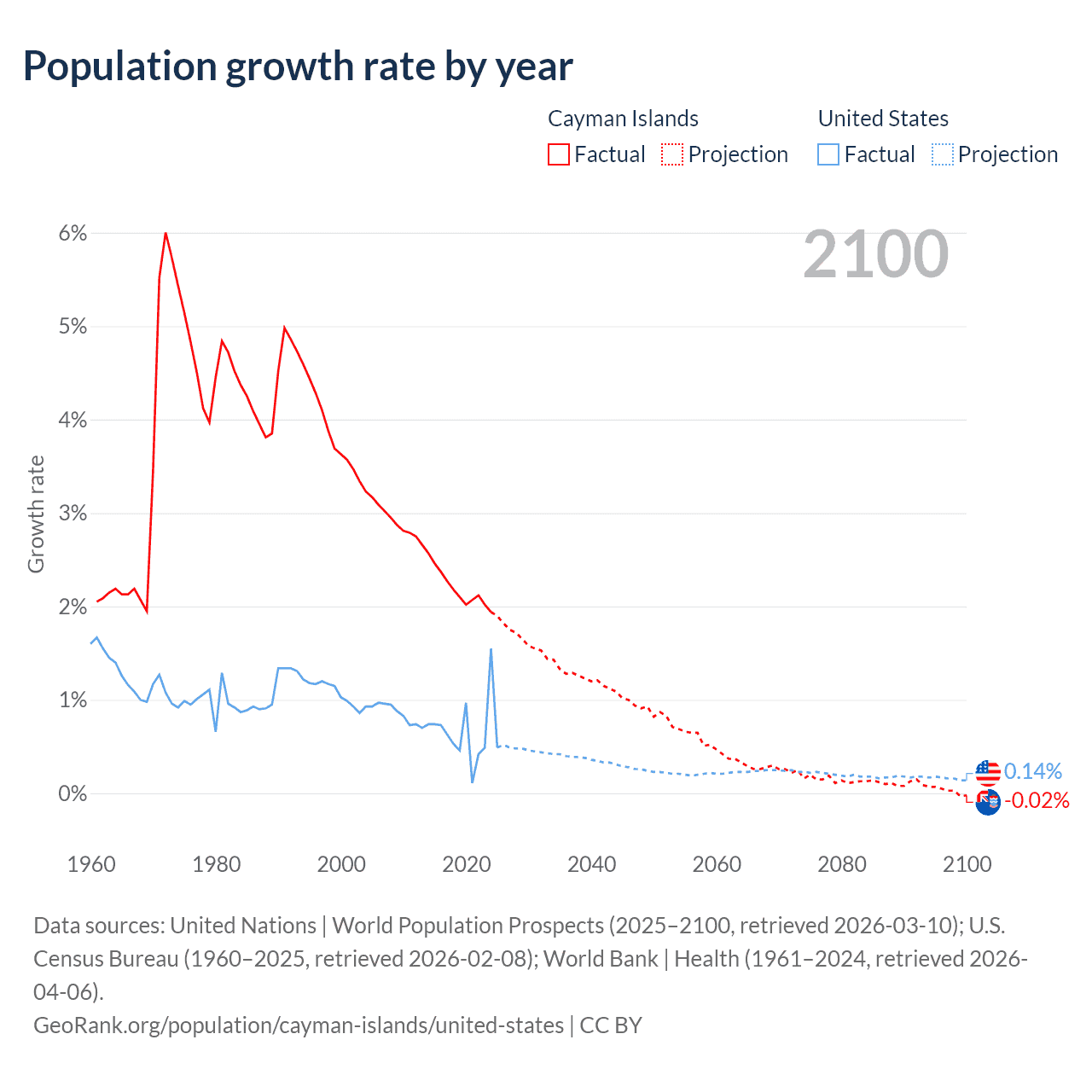 Data sources: World Bank | Health (1960–2024, retrieved 2026-04-06); United Nations | World Population Prospects (1960–2026, retrieved 2026-03-10); U.S. Census Bureau (1960–2025, retrieved 2026-02-08); Central Intelligence Agency (CIA) (2000–2019, retrieved 2026-02-20).