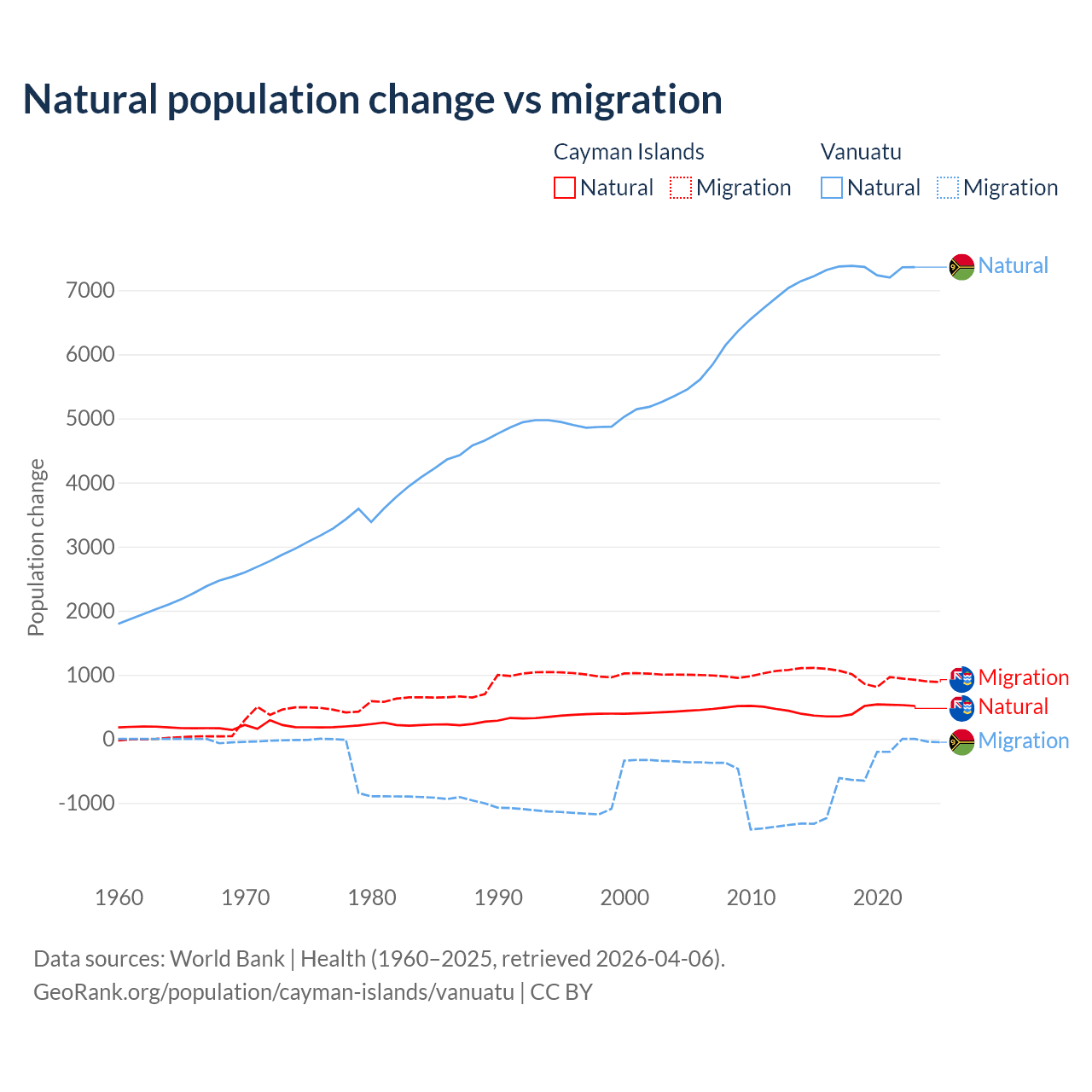 Over the last 10 years, 31.1% of the population change in the Cayman Islands is from natural causes (a gain of 4,468 people) and 68.9% is from migration (a gain of 9,879 people). In Vanuatu 92.2% is from natural causes (a gain of 72,941 people) and 7.81% is from migration (a loss of 6,181 people).
