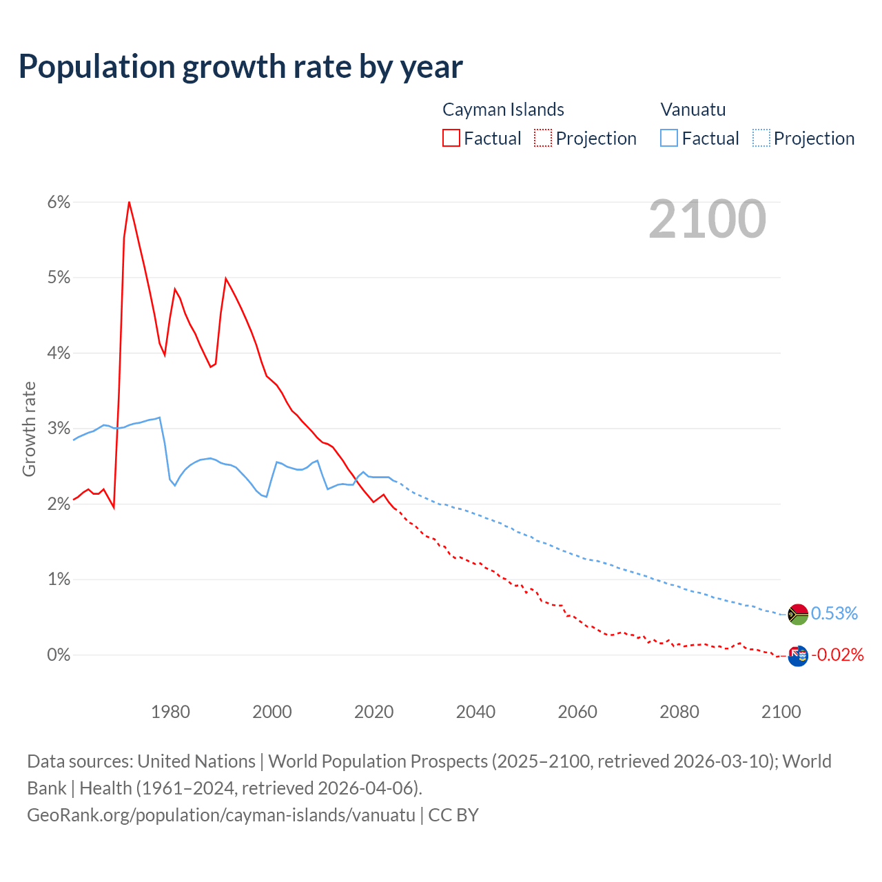- For the last 10 years, the Cayman Islands has had an average growth rate of +2.19% per year vs +2.33% in Vanuatu.