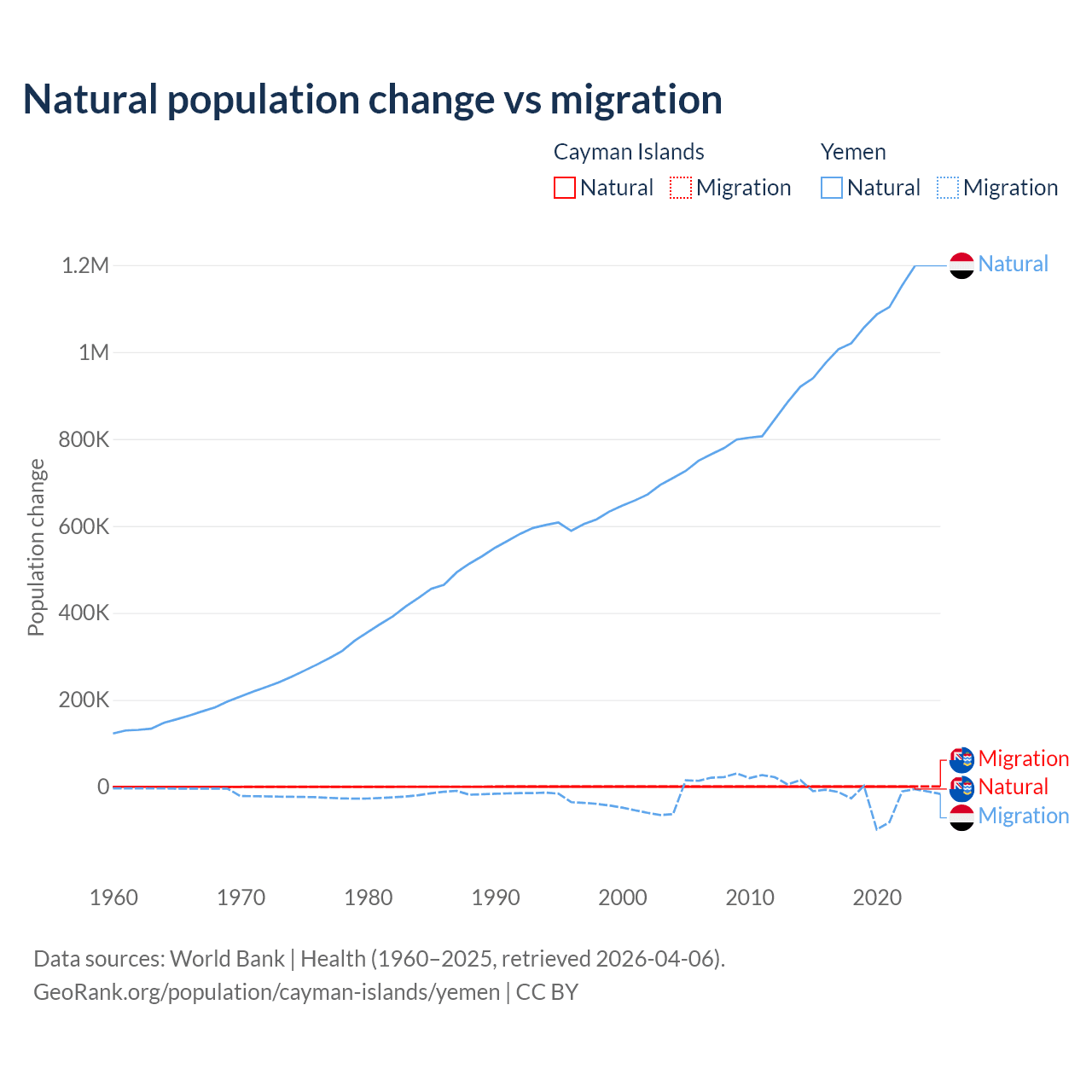 Over the last 10 years, 31.1% of the population change in the Cayman Islands is from natural causes (a gain of 4,468 people) and 68.9% is from migration (a gain of 9,879 people). In Yemen 97.8% is from natural causes (a gain of 10,460,813 people) and 2.17% is from migration (a loss of 231,814 people).