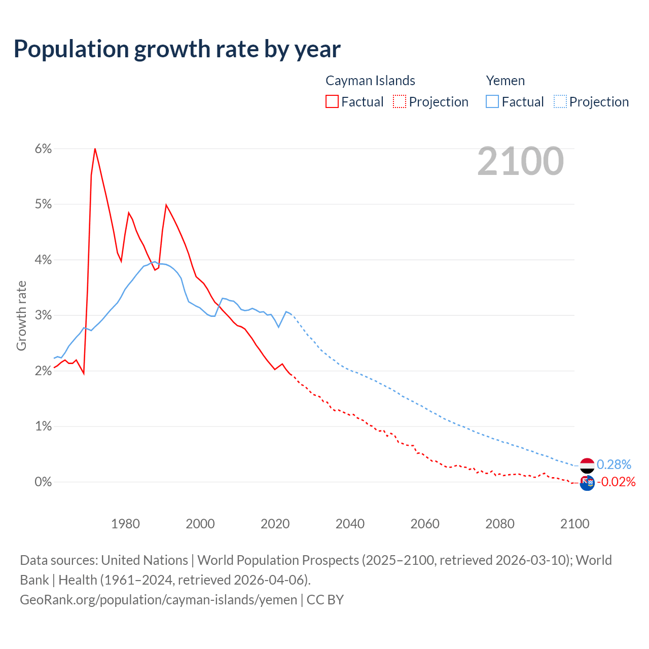 - For the last 10 years, the Cayman Islands has had an average growth rate of +2.19% per year vs +3% in Yemen.