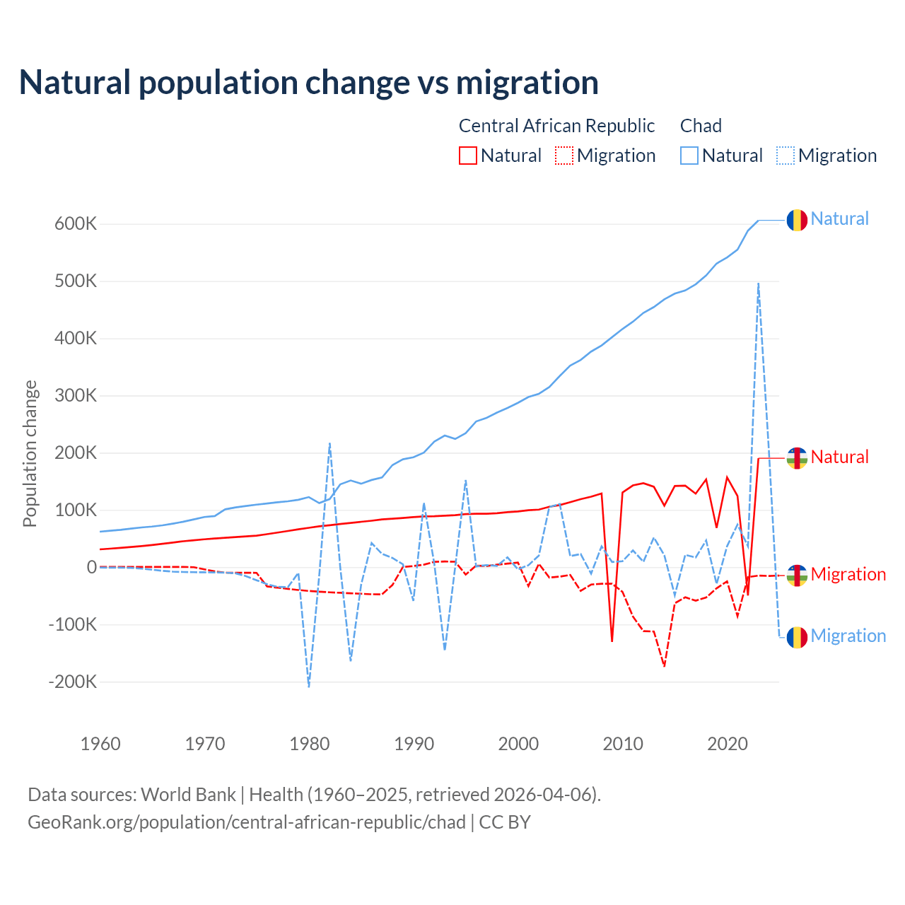 Over the last 10 years, 66.7% of the population change in the Central African Republic is from natural causes (a gain of 1,164,312 people) and 33.3% is from migration (a loss of 580,593 people). In Chad 88.7% is from natural causes (a gain of 5,253,964 people) and 11.3% is from migration (a gain of 672,204 people).