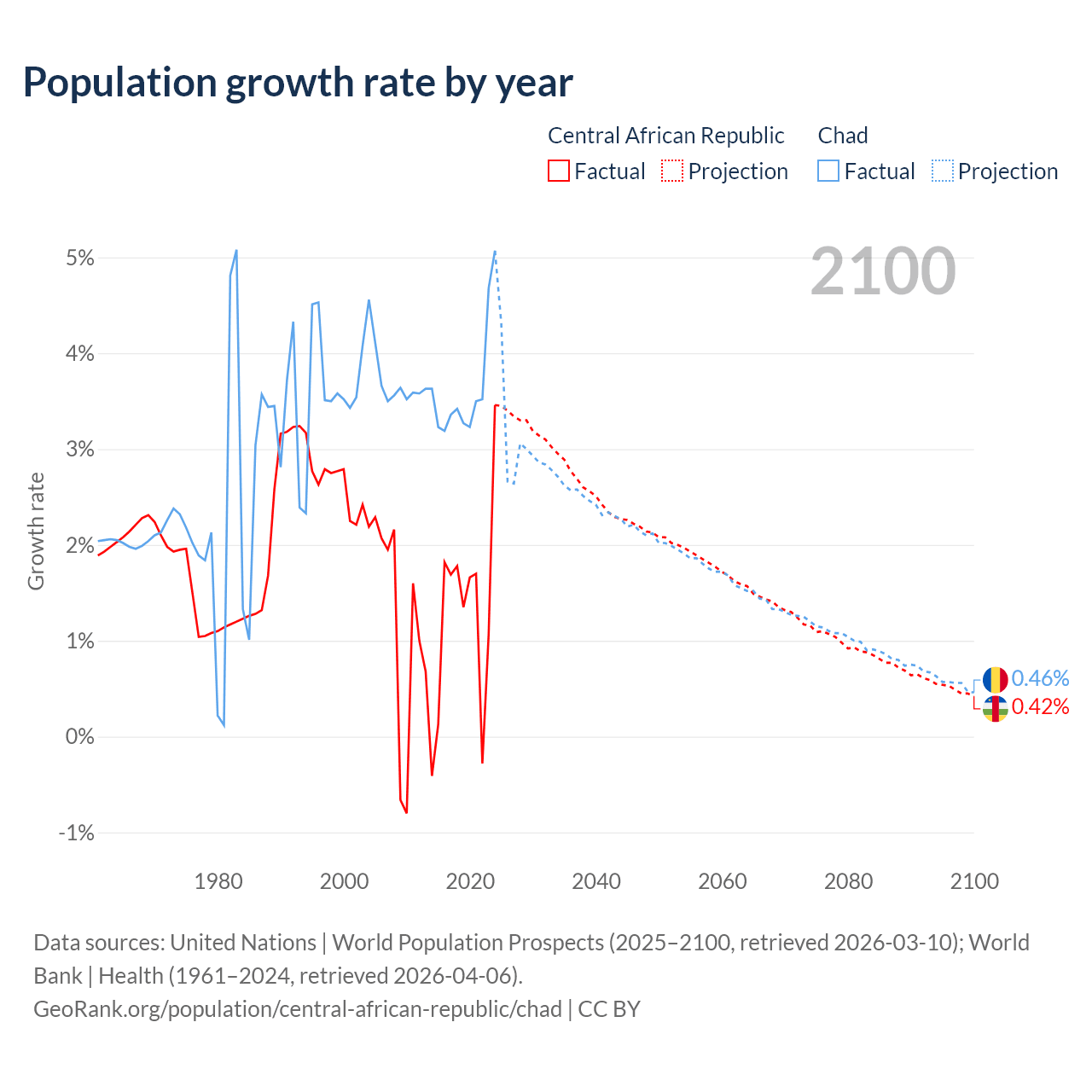 - For the last 10 years, the Central African Republic has had an average growth rate of +1.27% per year vs +3.65% in Chad.