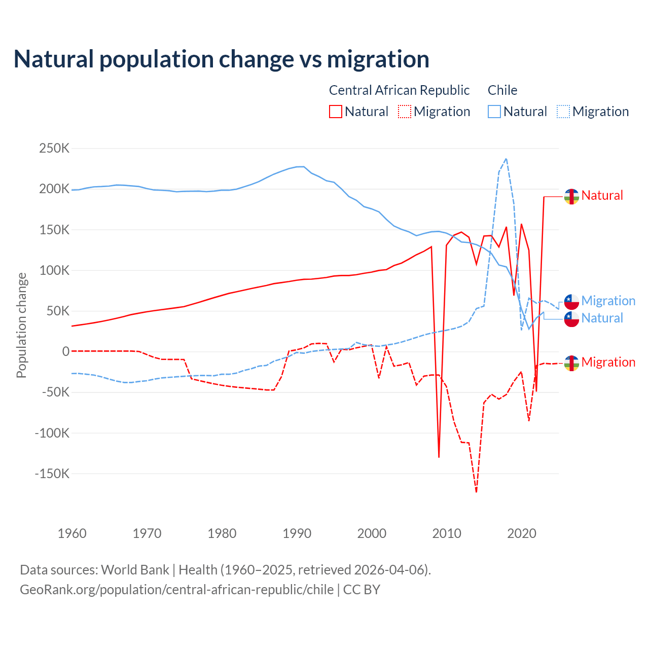 Over the last 10 years, 66.7% of the population change in the Central African Republic is from natural causes (a gain of 1,164,312 people) and 33.3% is from migration (a loss of 580,593 people). In Chile 43.5% is from natural causes (a gain of 844,683 people) and 56.5% is from migration (a gain of 1,097,597 people).