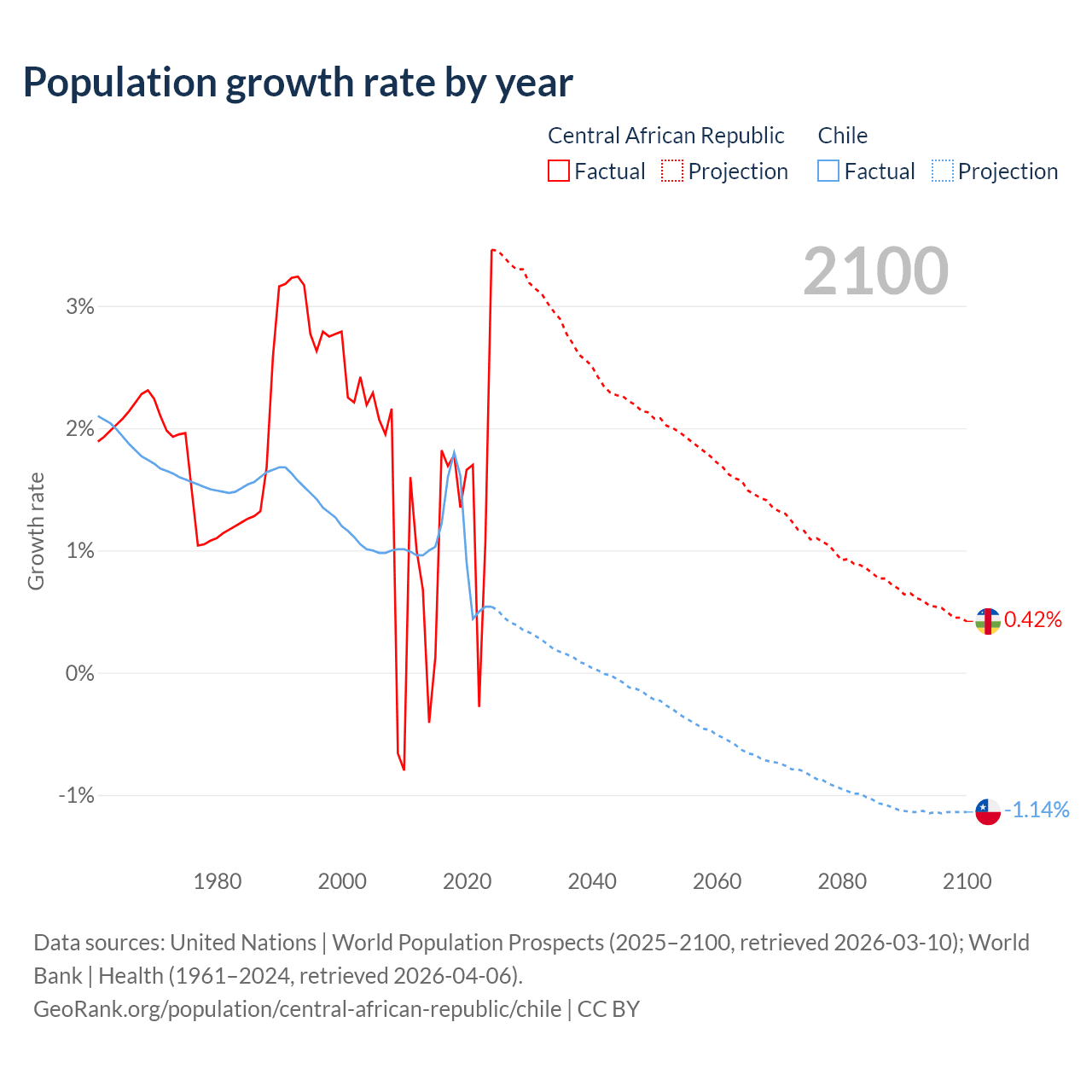 - For the last 10 years, the Central African Republic has had an average growth rate of +1.27% per year vs +1.02% in Chile.