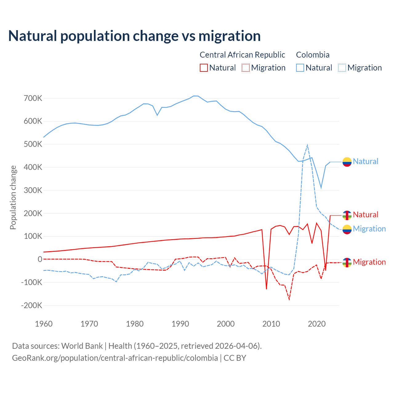 Over the last 10 years, 66.7% of the population change in the Central African Republic is from natural causes (a gain of 1,164,312 people) and 33.3% is from migration (a loss of 580,593 people). In Colombia 66.6% is from natural causes (a gain of 4,162,856 people) and 33.4% is from migration (a gain of 2,083,051 people).