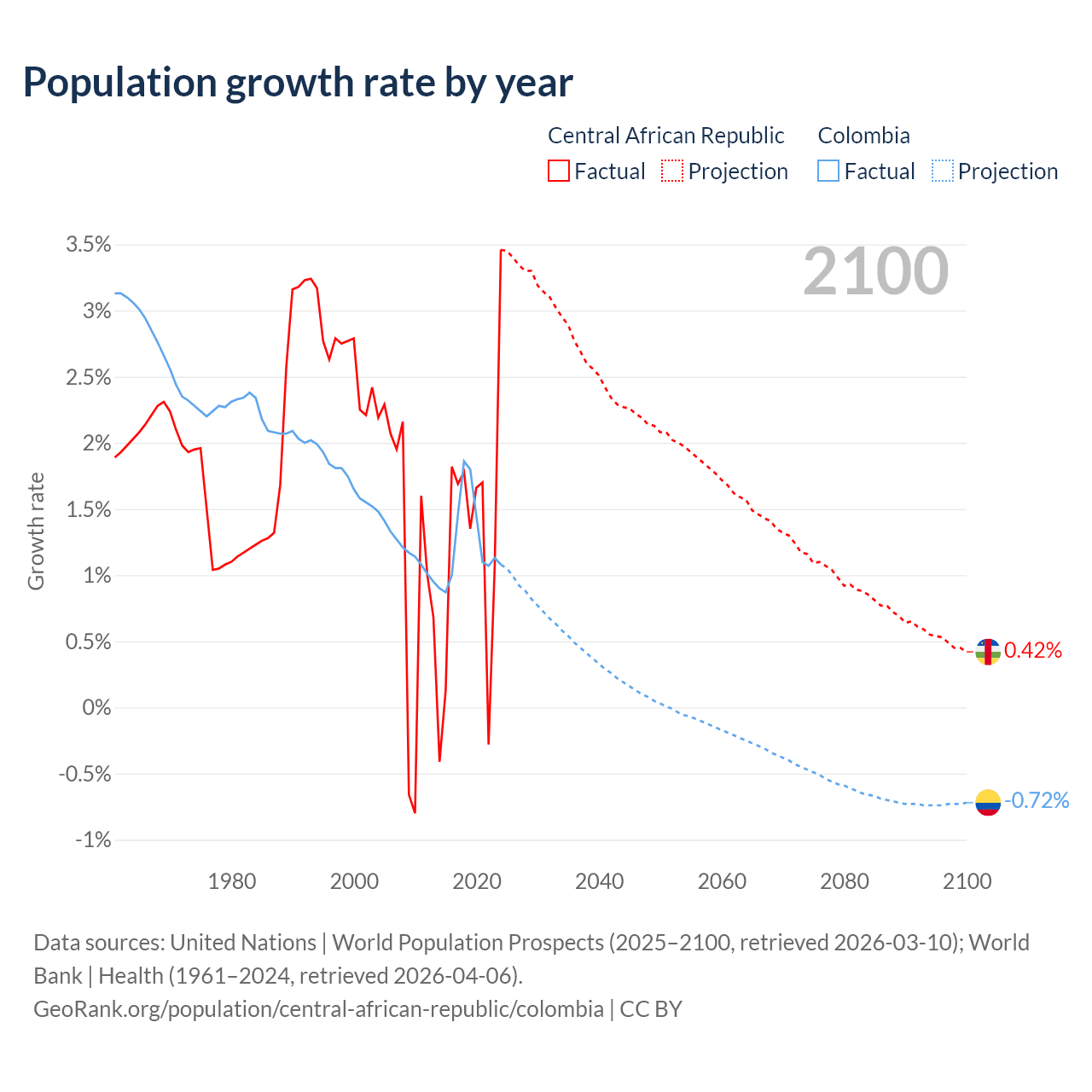 - For the last 10 years, the Central African Republic has had an average growth rate of +1.27% per year vs +1.25% in Colombia.