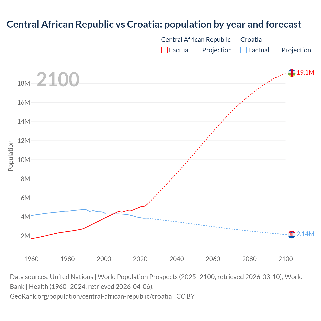 The latest officially reported population of the Central African Republic was 5,330,690 in 2024 vs 3,866,200 people in Croatia in 2024. In 2026, based on the adjusted UN estimation, the current Central African Republic's population is 5,753,659 people compared to 3,812,193 in Croatia.