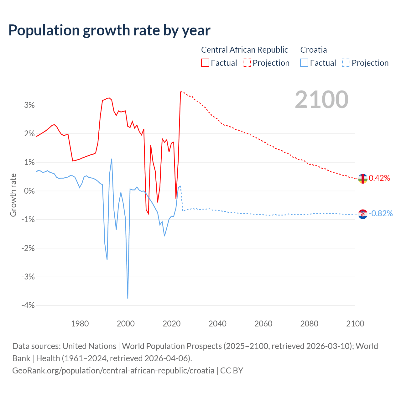 - For the last 10 years, the Central African Republic has had an average growth rate of +1.27% per year vs -0.82% in Croatia.