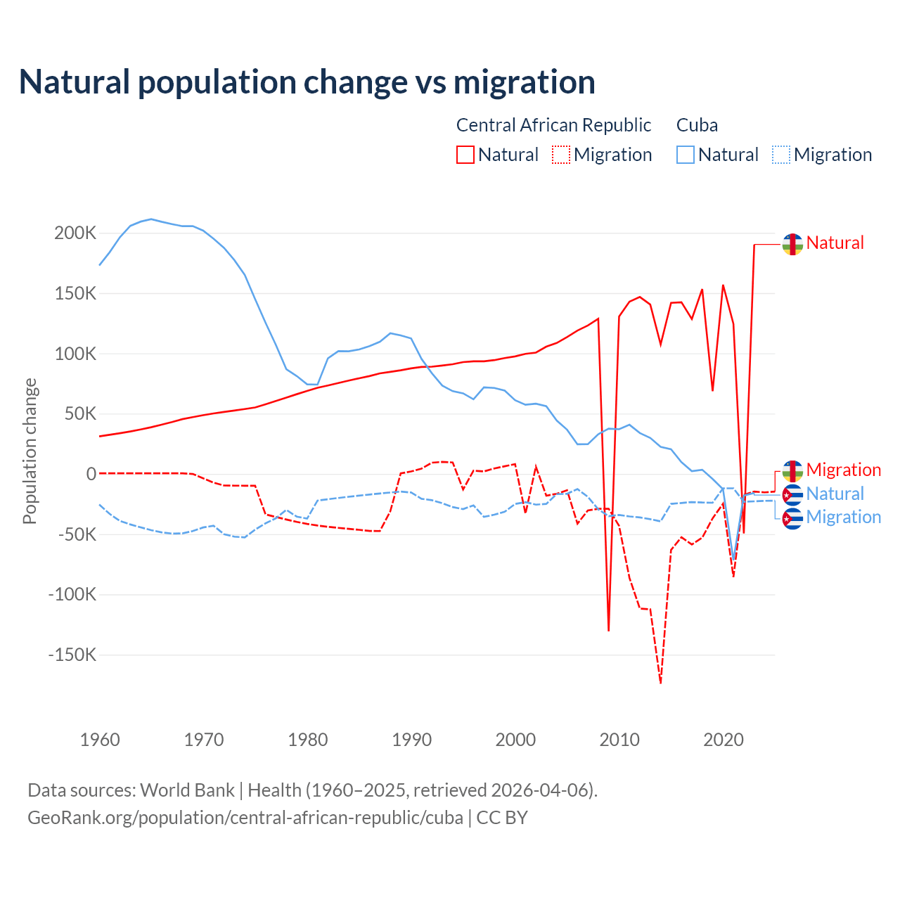 Over the last 10 years, 66.7% of the population change in the Central African Republic is from natural causes (a gain of 1,164,312 people) and 33.3% is from migration (a loss of 580,593 people). In Cuba 21.9% is from natural causes (a loss of 64,179 people) and 78.1% is from migration (a loss of 229,508 people).