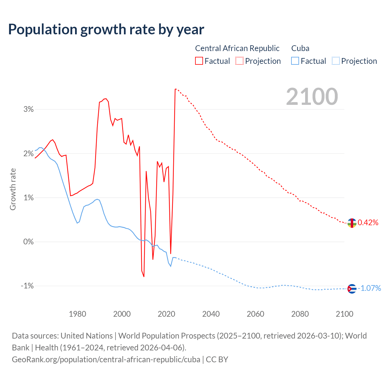 - For the last 10 years, the Central African Republic has had an average growth rate of +1.27% per year vs -0.26% in Cuba.