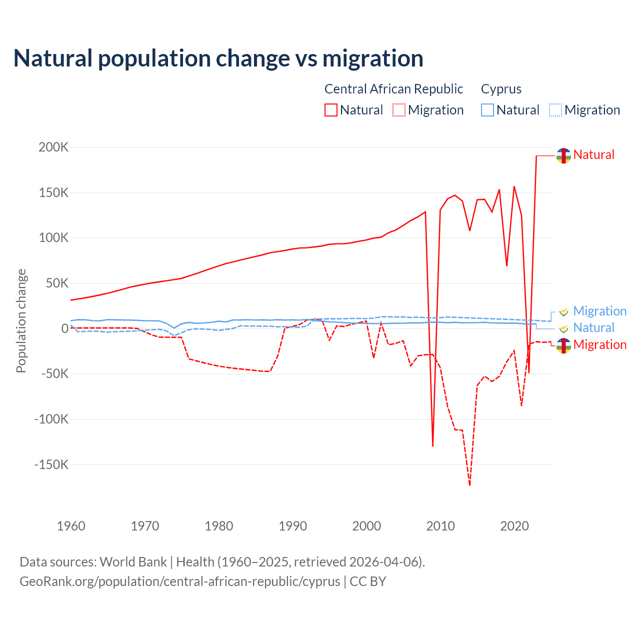 Over the last 10 years, 66.7% of the population change in the Central African Republic is from natural causes (a gain of 1,164,312 people) and 33.3% is from migration (a loss of 580,593 people). In Cyprus 36.2% is from natural causes (a gain of 57,464 people) and 63.8% is from migration (a gain of 101,458 people).