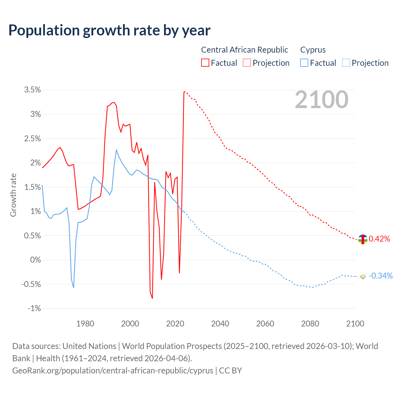 - For the last 10 years, the Central African Republic has had an average growth rate of +1.27% per year vs +1.26% in Cyprus.