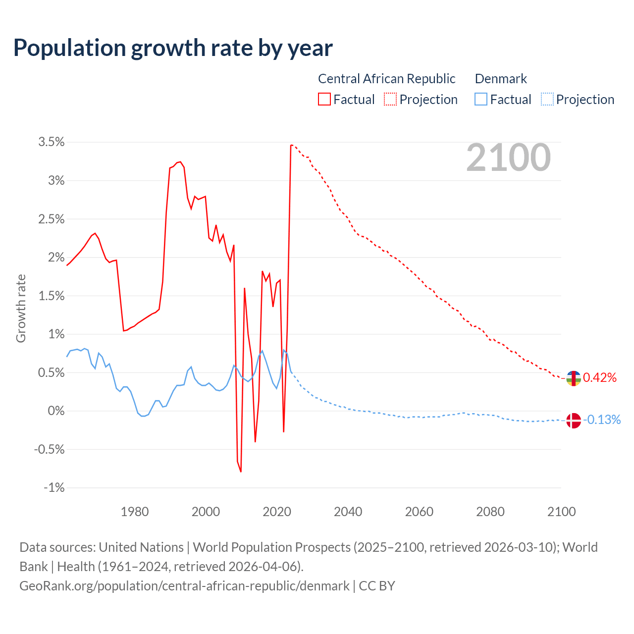 - For the last 10 years, the Central African Republic has had an average growth rate of +1.27% per year vs +0.57% in Denmark.