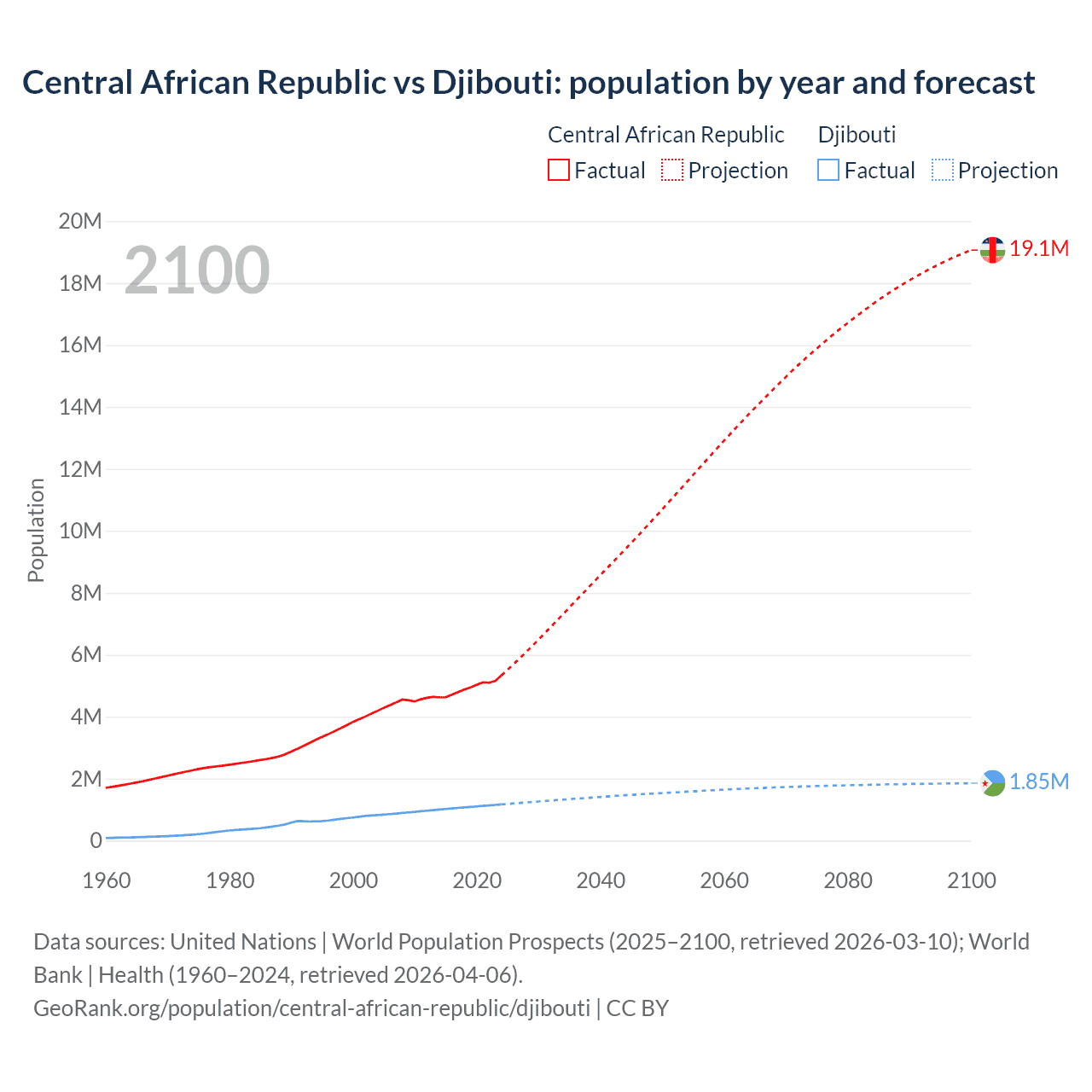 The latest officially reported population of the Central African Republic was 5,330,690 in 2024 vs 1,168,722 people in Djibouti in 2024. In 2026, based on the adjusted UN estimation, the current Central African Republic's population is 5,753,659 people compared to 1,203,929 in Djibouti.