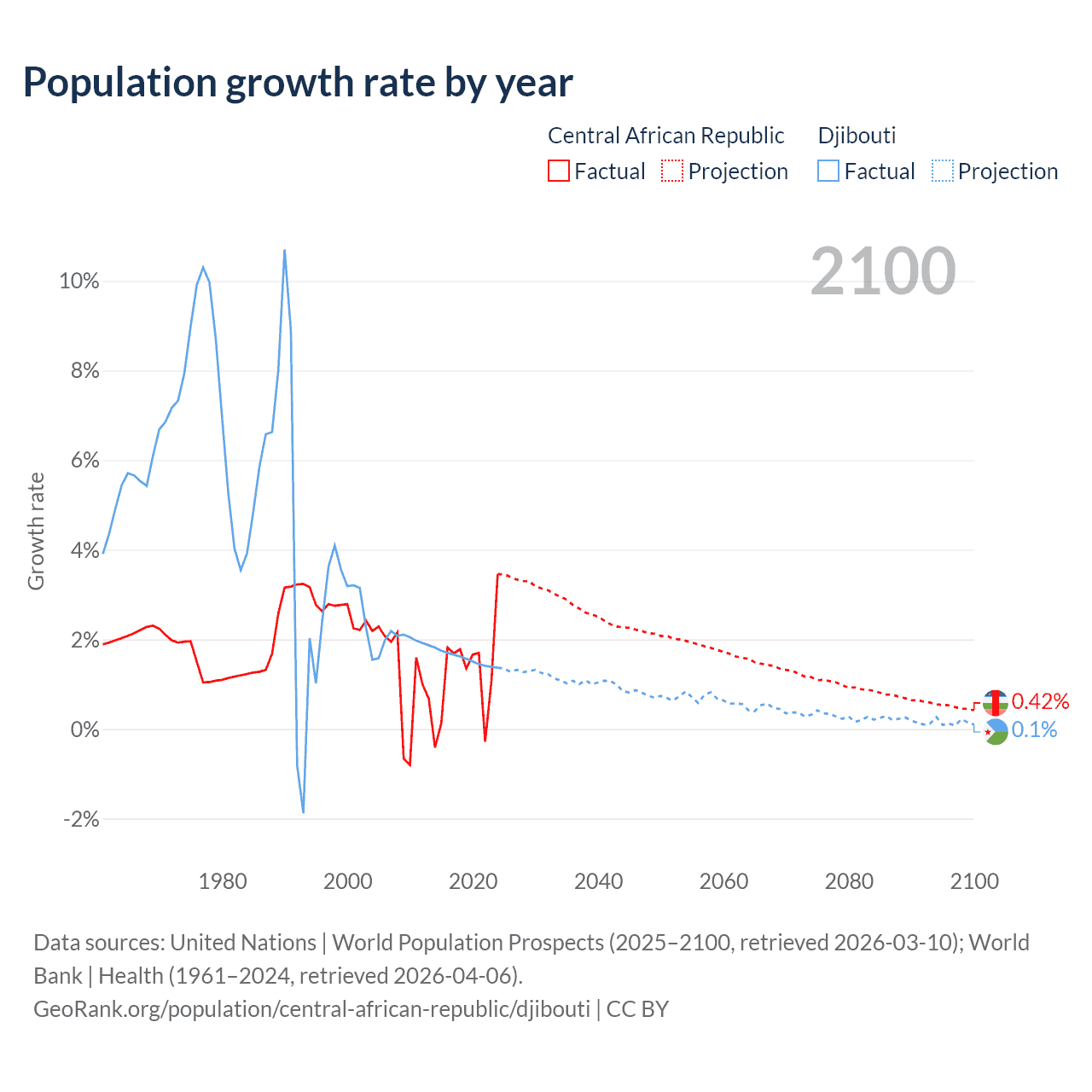 - For the last 10 years, the Central African Republic has had an average growth rate of +1.27% per year vs +1.57% in Djibouti.