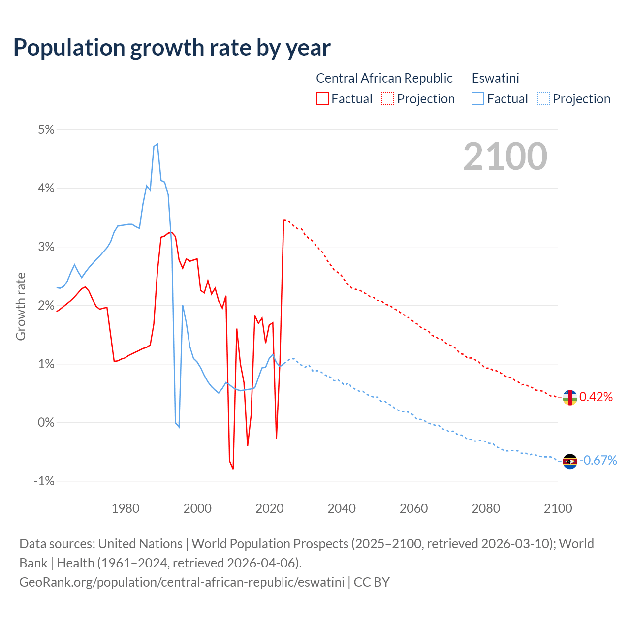 - For the last 10 years, the Central African Republic has had an average growth rate of +1.27% per year vs +0.87% in Eswatini.