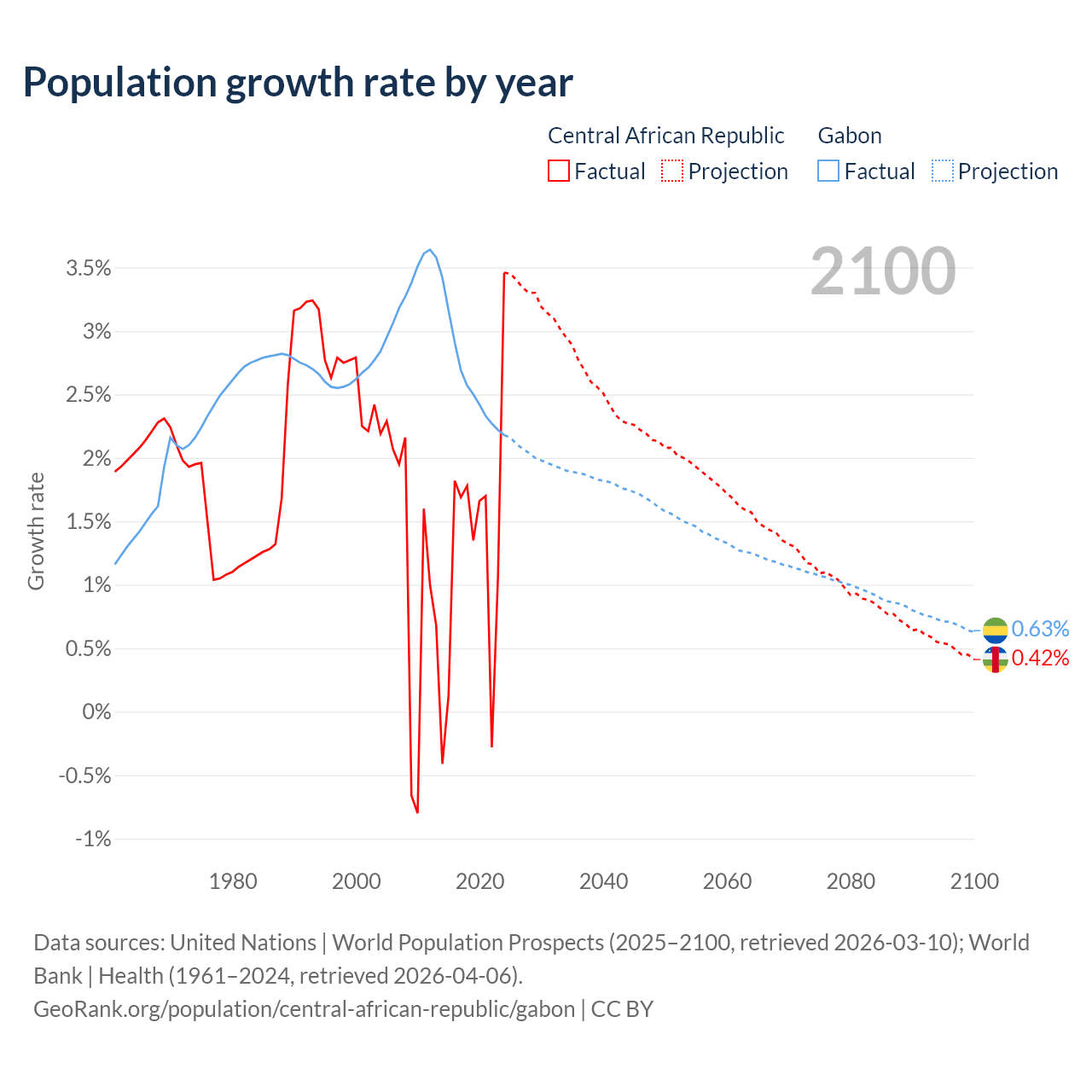 - For the last 10 years, the Central African Republic has had an average growth rate of +1.27% per year vs +2.61% in Gabon.