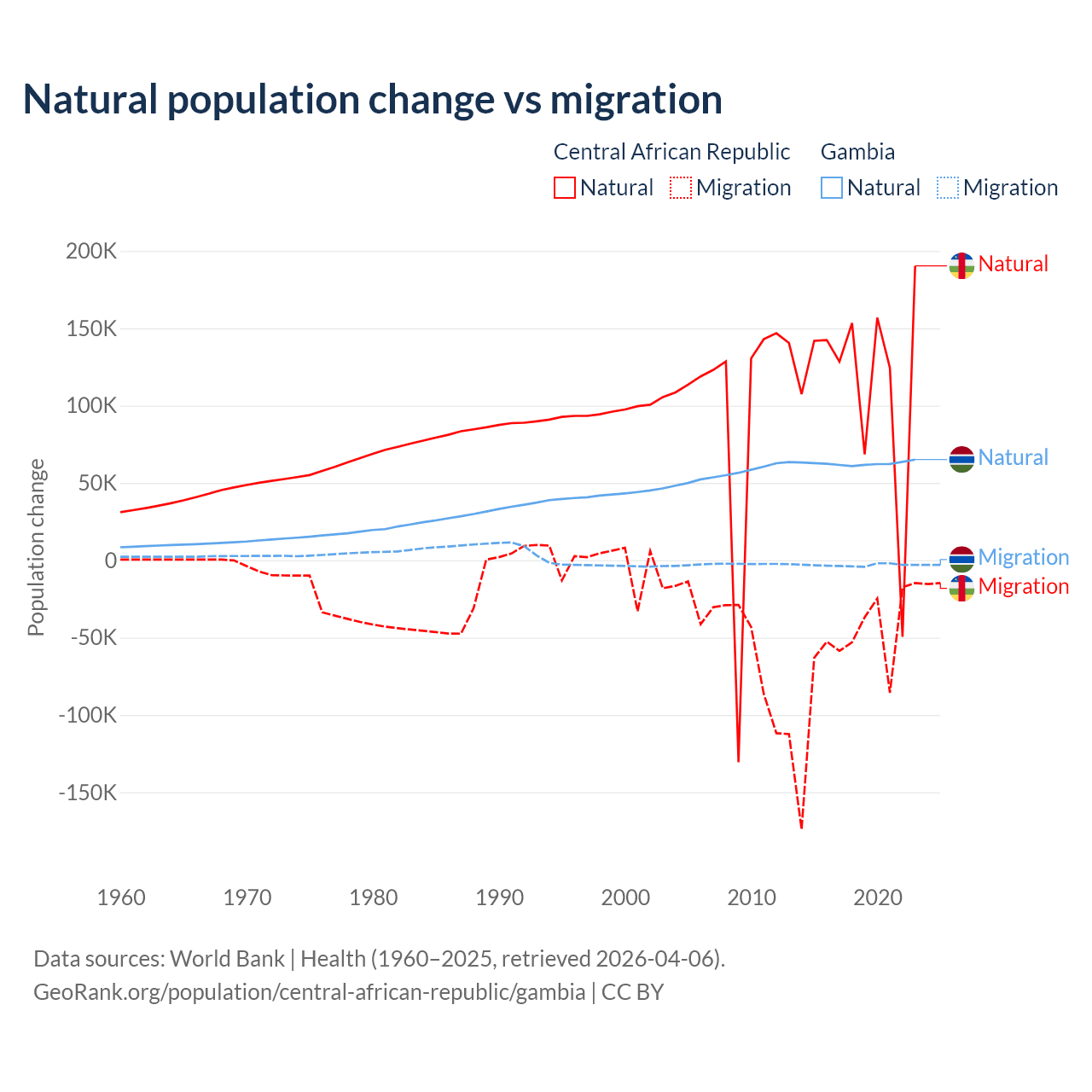 Over the last 10 years, 66.7% of the population change in the Central African Republic is from natural causes (a gain of 1,164,312 people) and 33.3% is from migration (a loss of 580,593 people). In the Gambia 95.2% is from natural causes (a gain of 625,795 people) and 4.75% is from migration (a loss of 31,227 people).