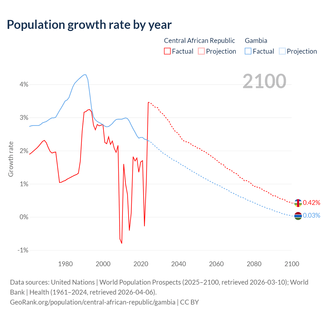 - For the last 10 years, the Central African Republic has had an average growth rate of +1.27% per year vs +2.5% in the Gambia.
