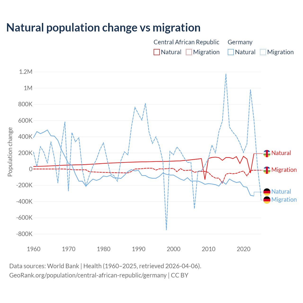 Over the last 10 years, 66.7% of the population change in the Central African Republic is from natural causes (a gain of 1,164,312 people) and 33.3% is from migration (a loss of 580,593 people). In Germany 26.8% is from natural causes (a loss of 2,036,130 people) and 73.2% is from migration (a gain of 5,565,916 people).