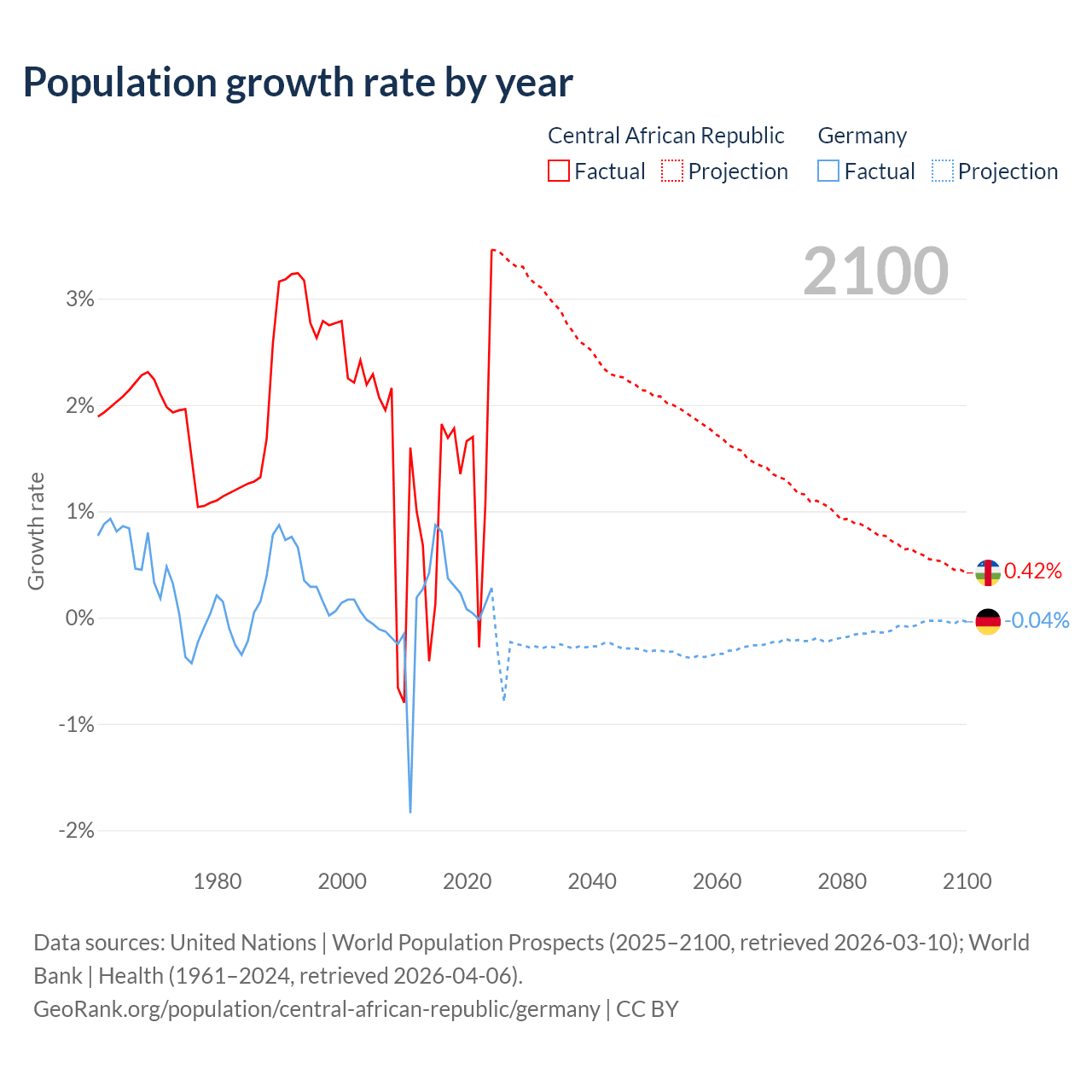 - For the last 10 years, the Central African Republic has had an average growth rate of +1.27% per year vs +0.32% in Germany.